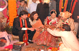 This procession escorts them to the main entrance. The entire area is decorated with special Rangoli (geometrical patterns and motifs made by using color powder and flower petals) on floor, rose laid pathways, flowers, Red Carpet, old drums and grand trumpet announcing the arrival of guests.